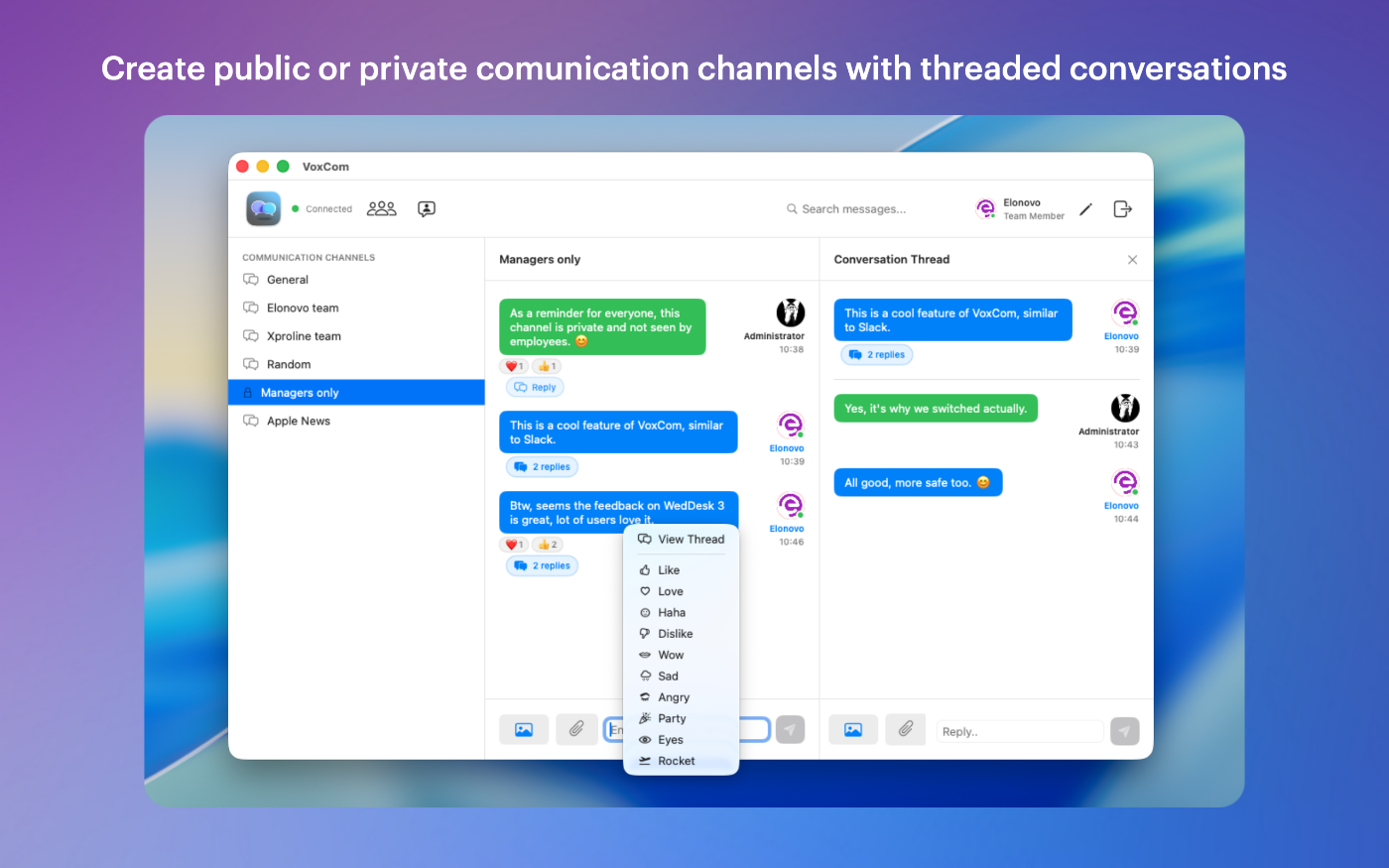 Create unlimited public channels for team discussions and private channels for confidential conversationsThreaded Conversations