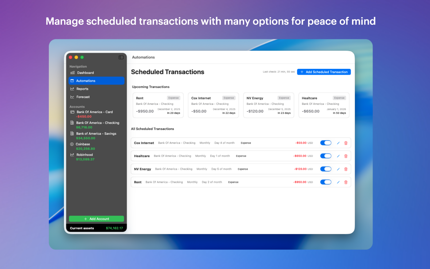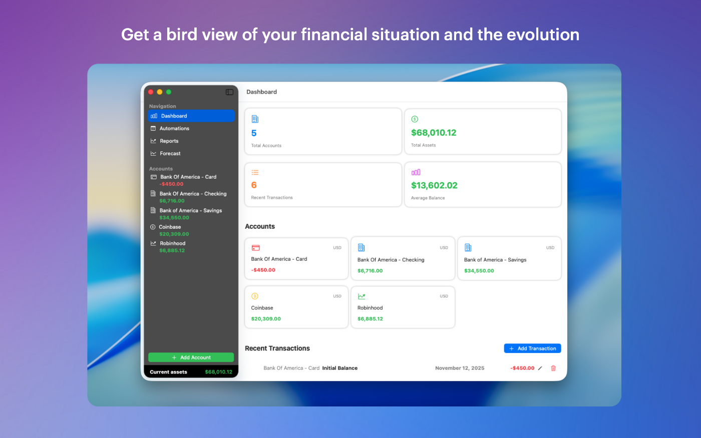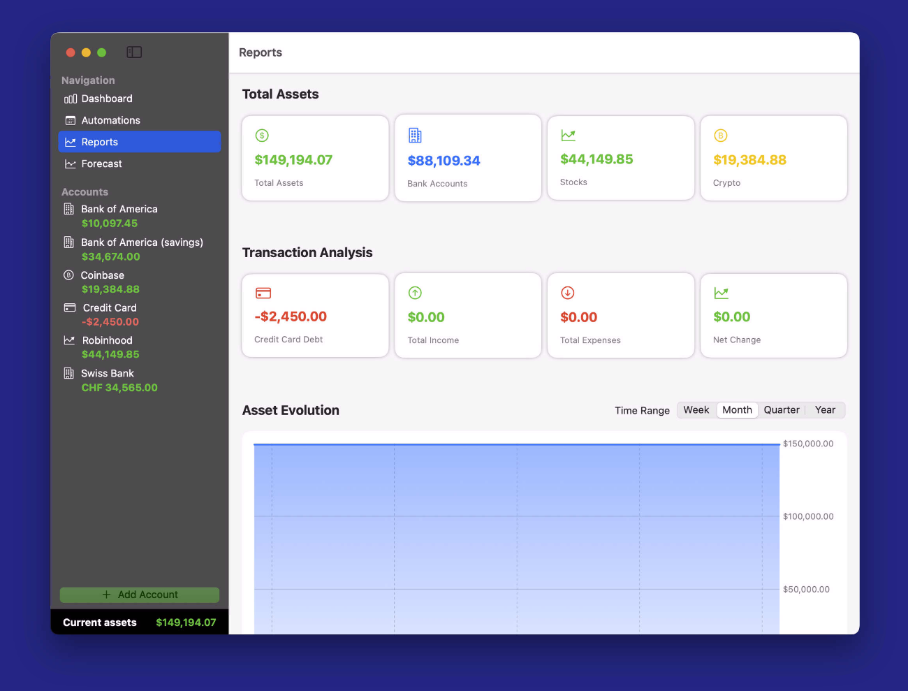 Visualize trends with asset evolution lines, account distribution charts, and income/expense analysis.Set-and-forget automations