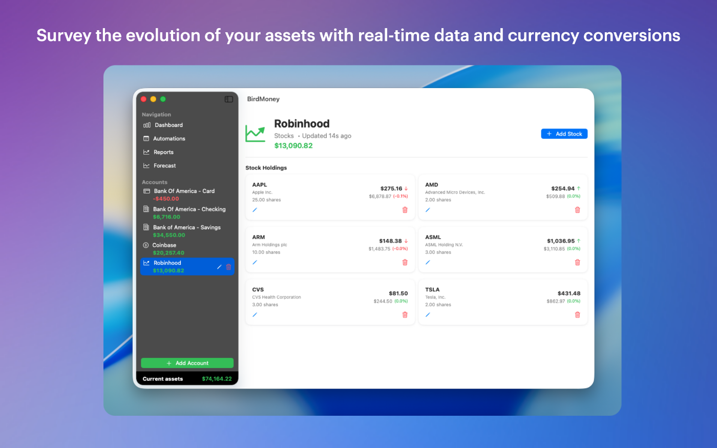 Get automatic updates of your shares of stock and cryptos currenciesMulti‑currency smarts