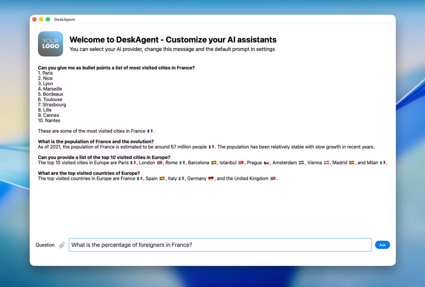 The interface is crafted with professional aesthetics in mind, featuring a highly customizable canvas that lets you define the personality and visual identity of your assistant. From defining unique system prompts and custom welcome sequences to selecting specific typography and color palettes, every aspect of the experience can be tailored to match your workflow. DeskAgent handles modern media with ease, supporting intuitive drag-and-drop for images and files, while providing rich-text previews that make interacting with AI output feel as natural as using a native macOS document editor.