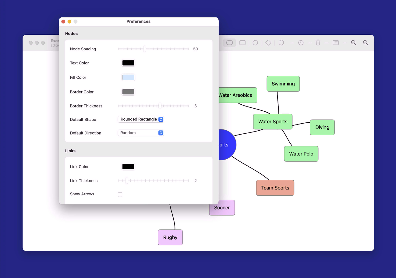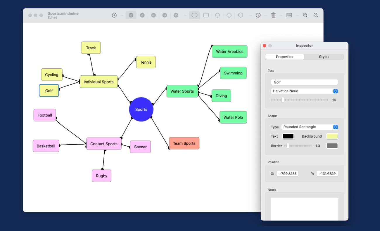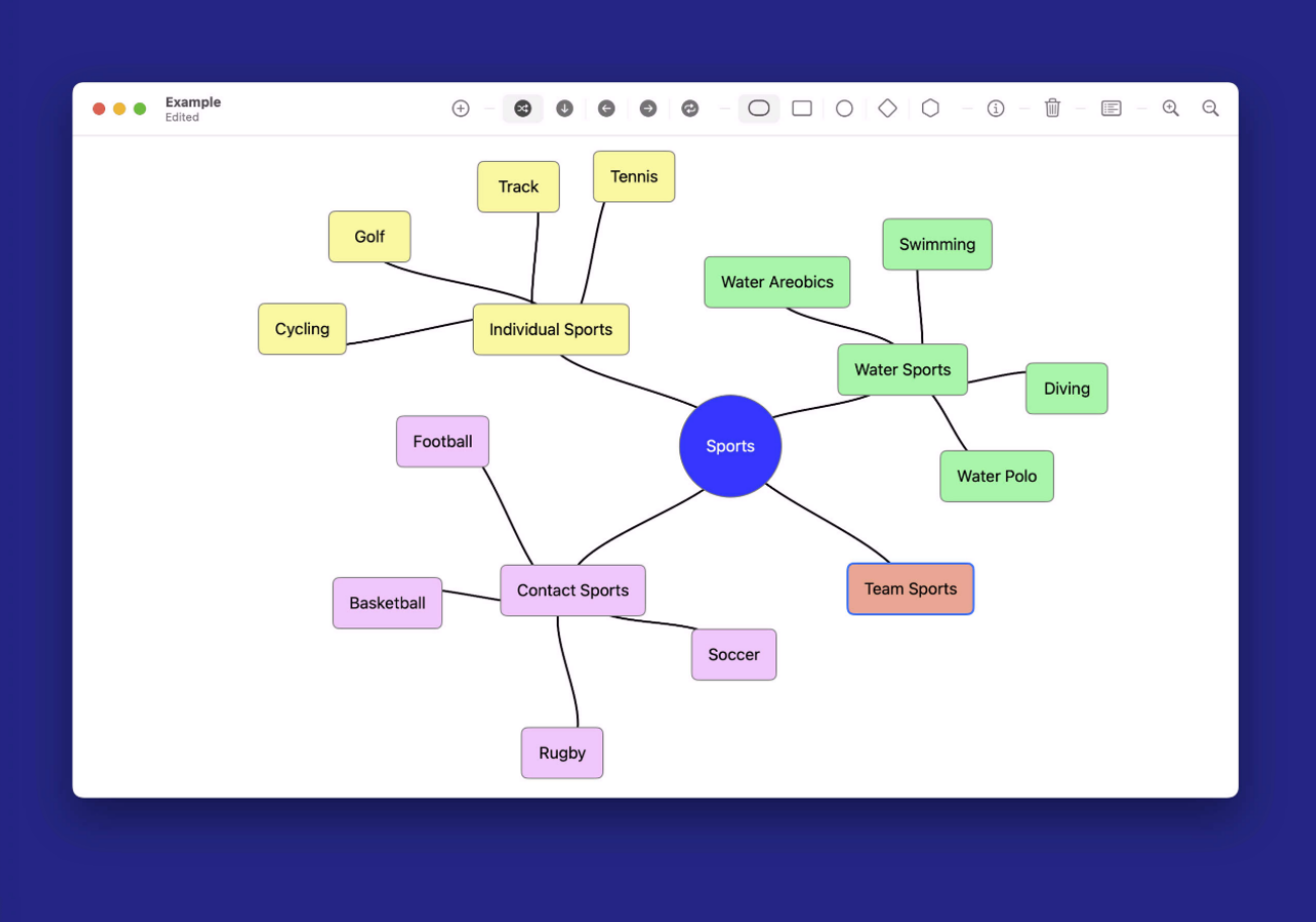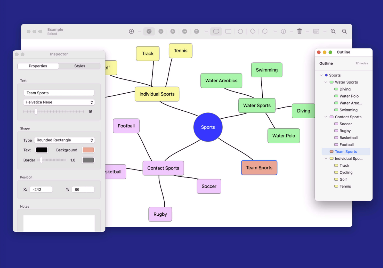 Intuitive Visual Mind Mapping Multiple Node Shapes & Styles Smart Layout Algorithms Integrated Outline View Comprehensive Inspector Panel Native macOS Experience Compatible iPad version