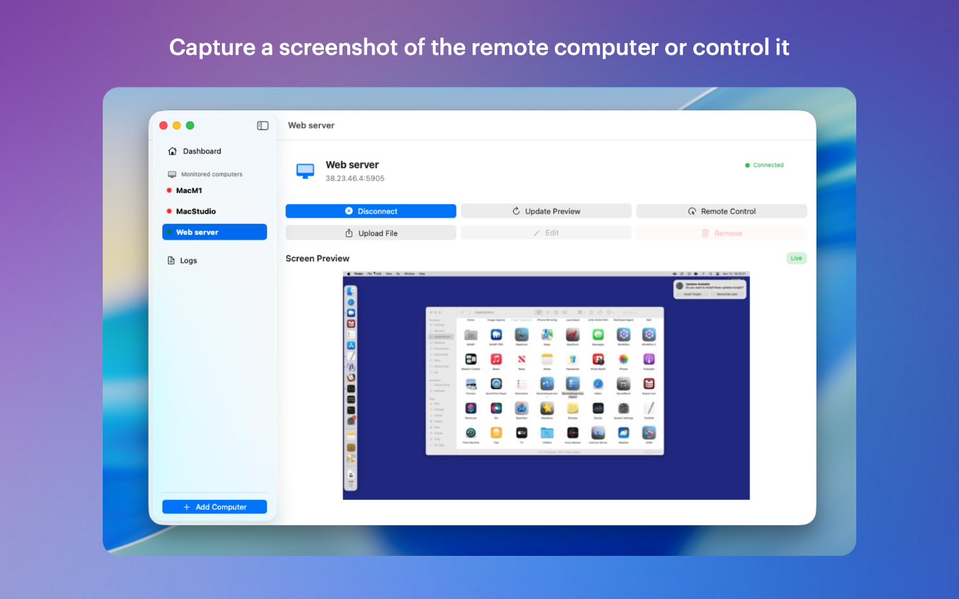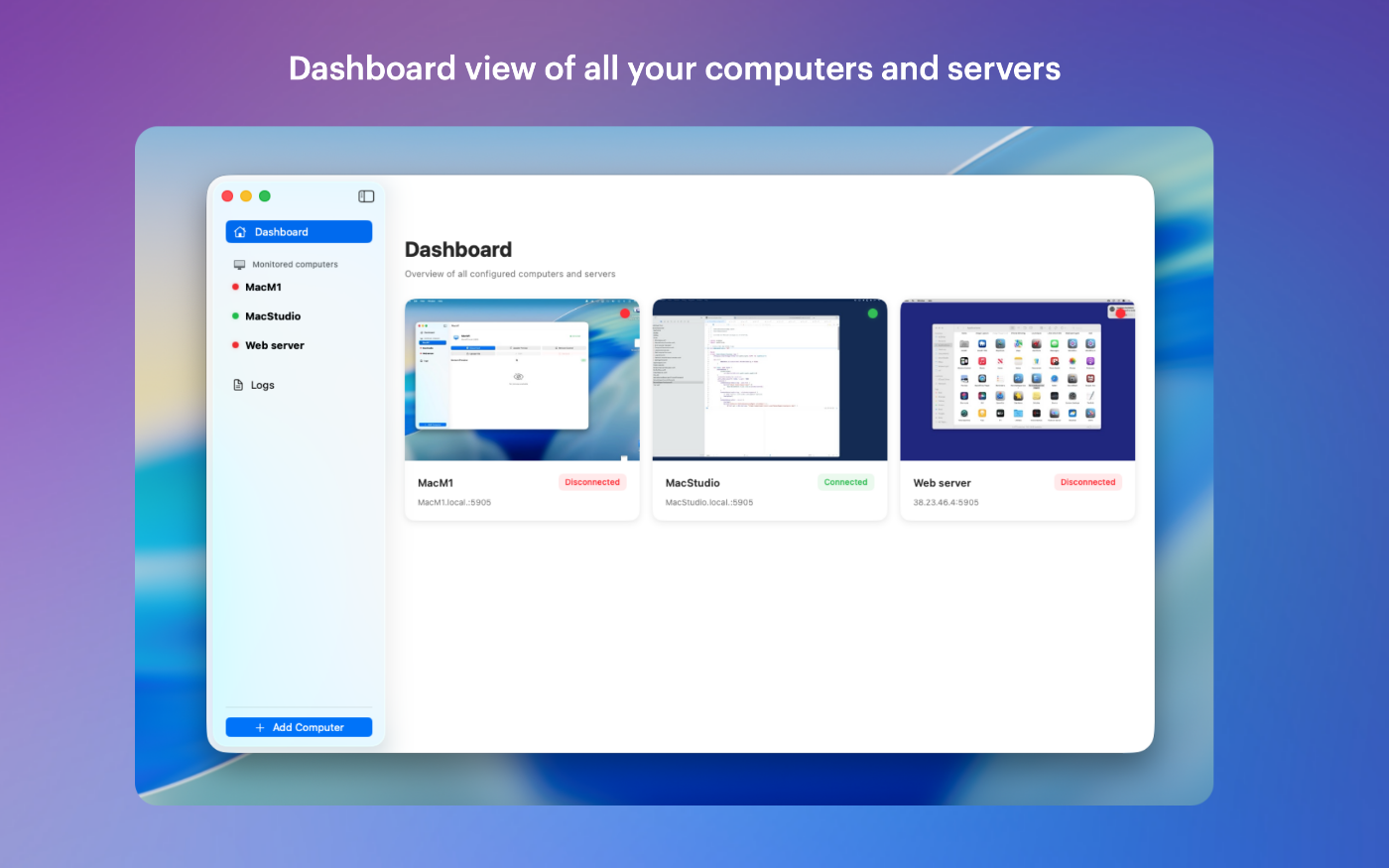 RemoteSupervisor is a powerful yet elegant remote desktop solution that lets you take control of any Mac from anywhere. Built with privacy and simplicity at its core, it provides seamless screen sharing, real-time remote control, and secure file transfers through a beautiful, native macOS interface. Using the advanced NRSP protocol and ScreenCaptureKit integration, RemoteSupervisor delivers high-performance screen streaming. Connect to any Mac on your network through automatic Bonjour discovery or manual IP configuration, with secure authentication using your macOS system credentials. On the target Mac, just install the RemoteSupervisorAgent freeware app, grant the necessary permissions during the one-time setup assistant, and your computer is immediately discoverable on the network. Perfect for home offices where you want to access your powerful desktop Mac from your laptop, for IT professionals managing multiple machines. An iPad version of the monitoring app is also available.