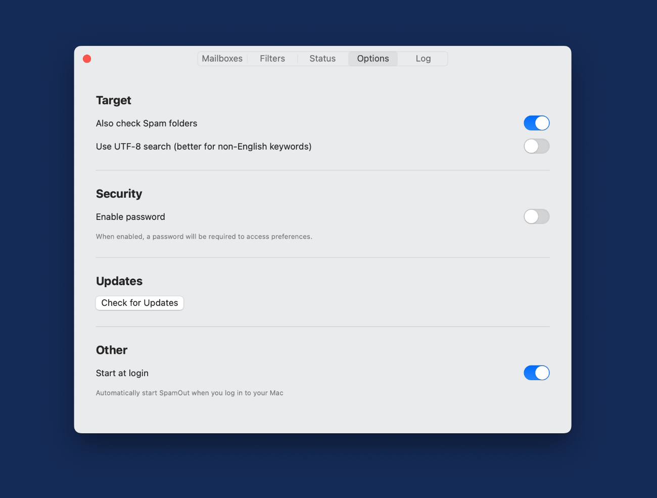 SpamOut is your personal spam guardian for macOS, an elegant, lightweight menu bar app that quietly keeps your inbox clean.