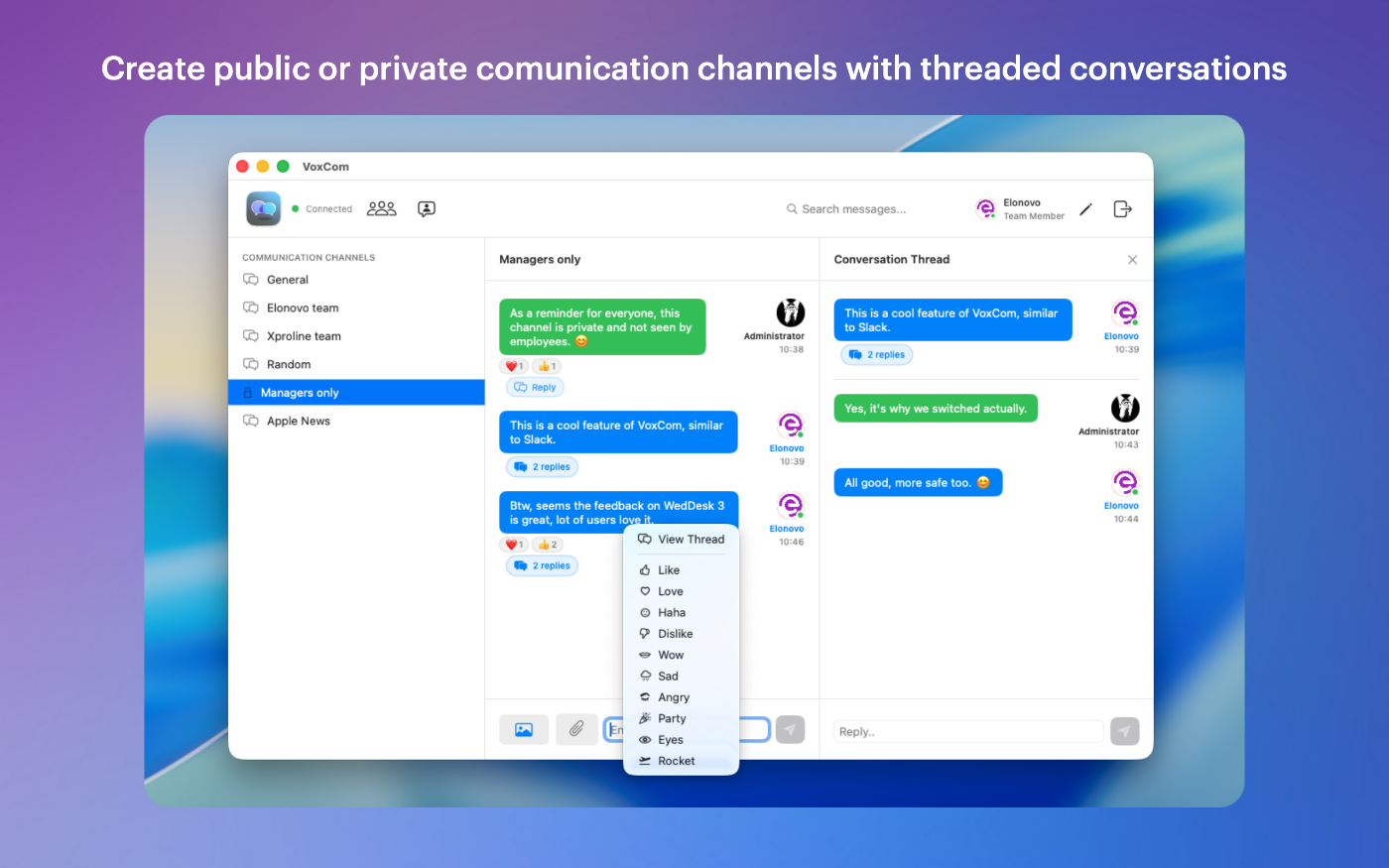 Create unlimited public channels for team discussions and private channels for confidential conversationsThreaded Conversations
