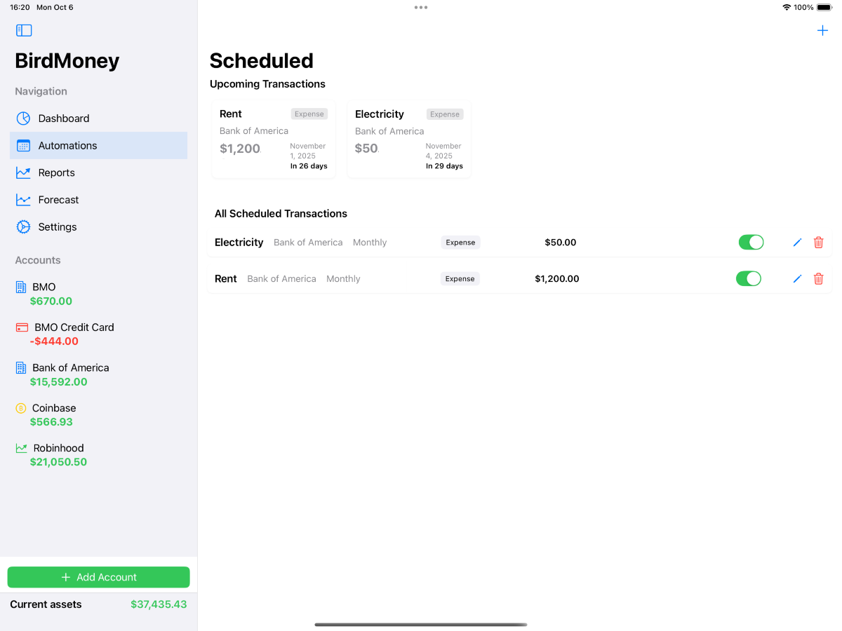Visualize trends with asset evolution lines, account distribution charts, and income/expense analysis.Set-and-forget automations