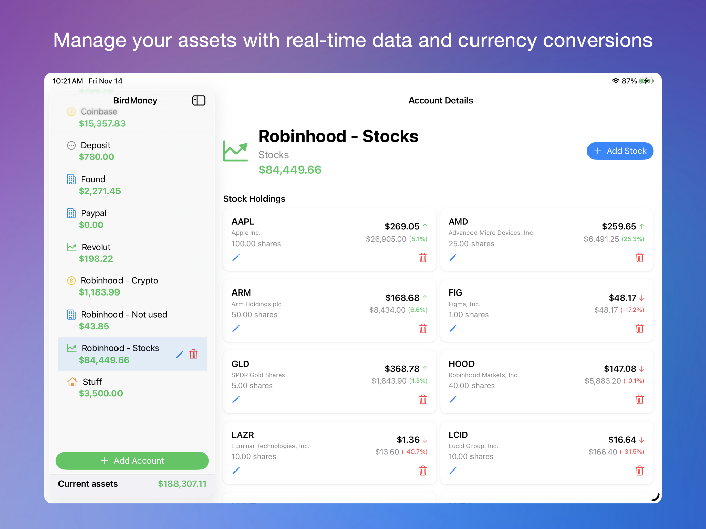 See total assets, average balance, recent activity, and every account at a glance.Live data for stocks and cryptos