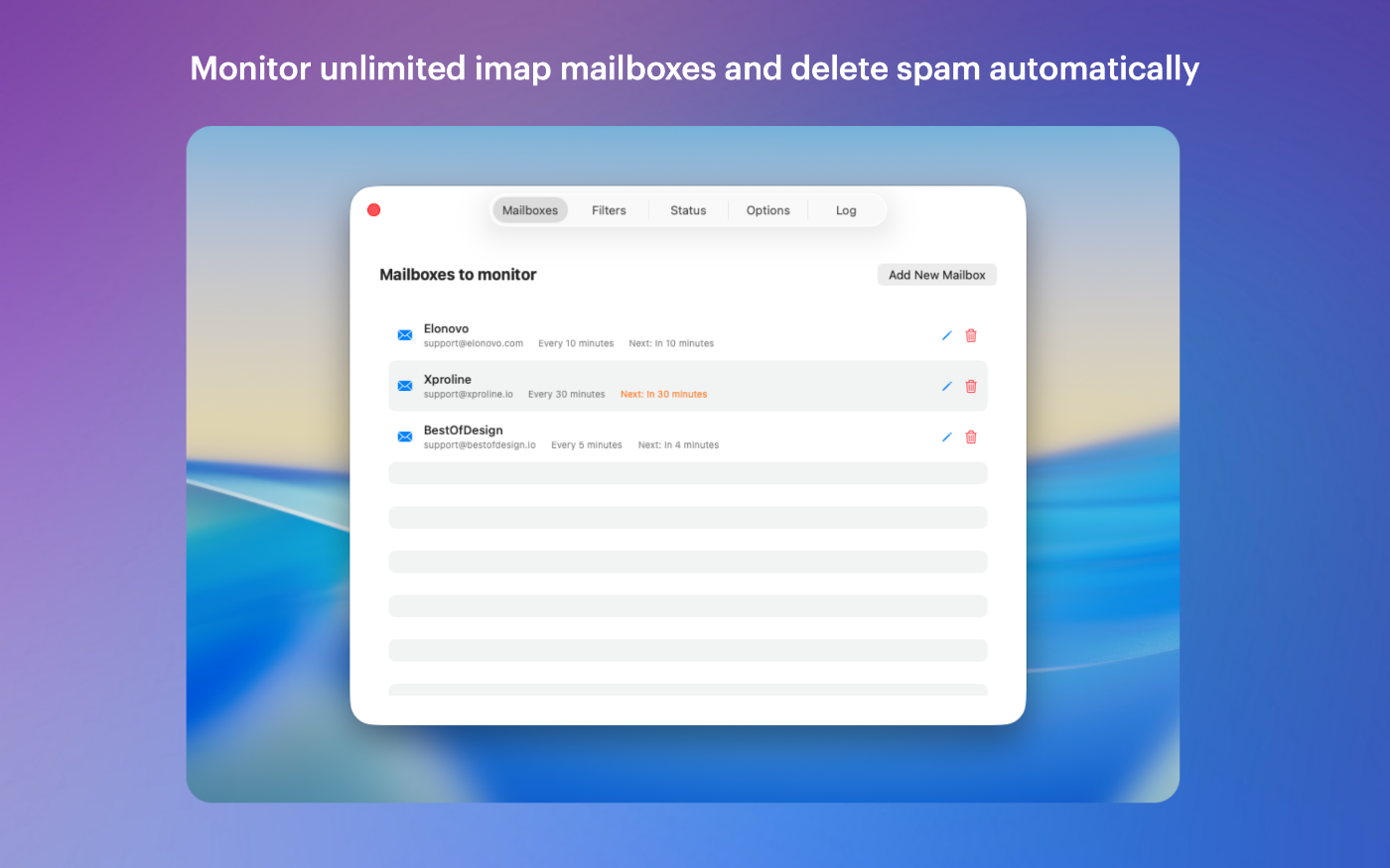 Point it at your IMAP accounts and let it work: define the subject keywords and senders you never want to see again, choose how often each mailbox is checked, and optional spam‑folder sweeps ensure nothing slips through.