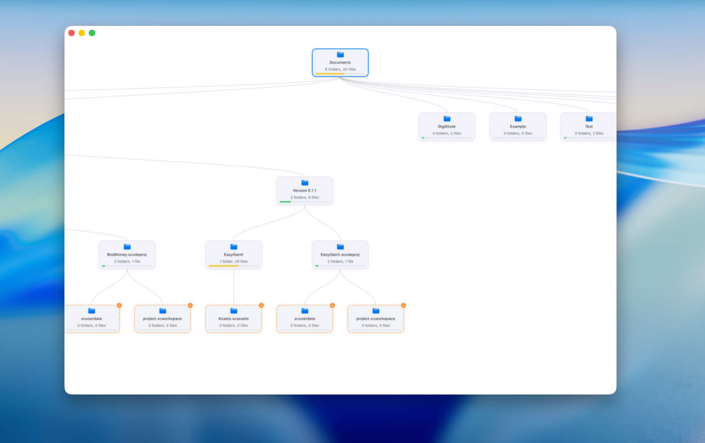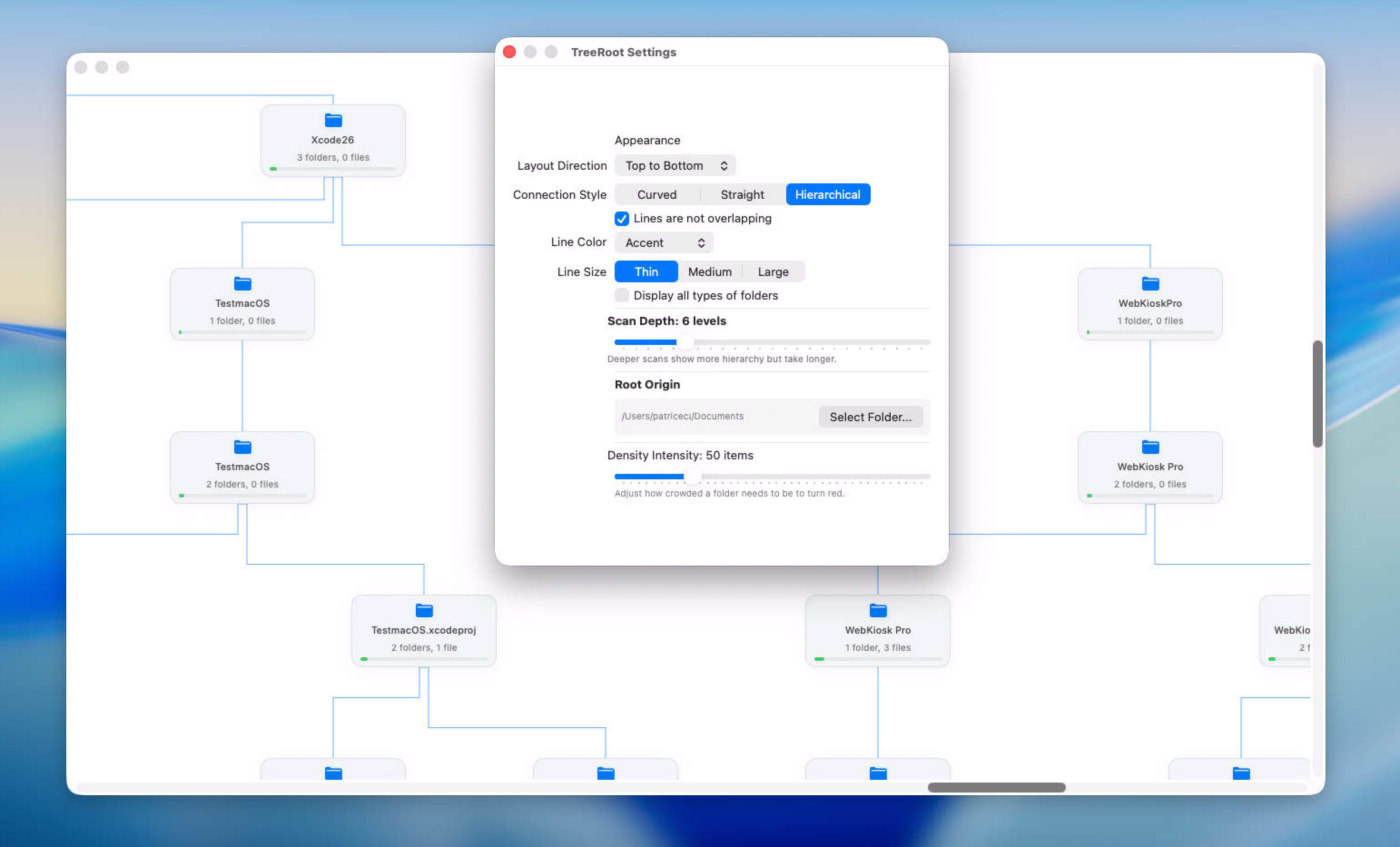 Choose any folder as the root, set how deep to scan, and TreeRoot builds a spatial map of your structure. Folders appear as nodes, connected by lines you can style as curved, straight, or hierarchical. Each node shows how many items it contains, and color-coded density highlights crowded folders so you can quickly spot where your data is concentrated.