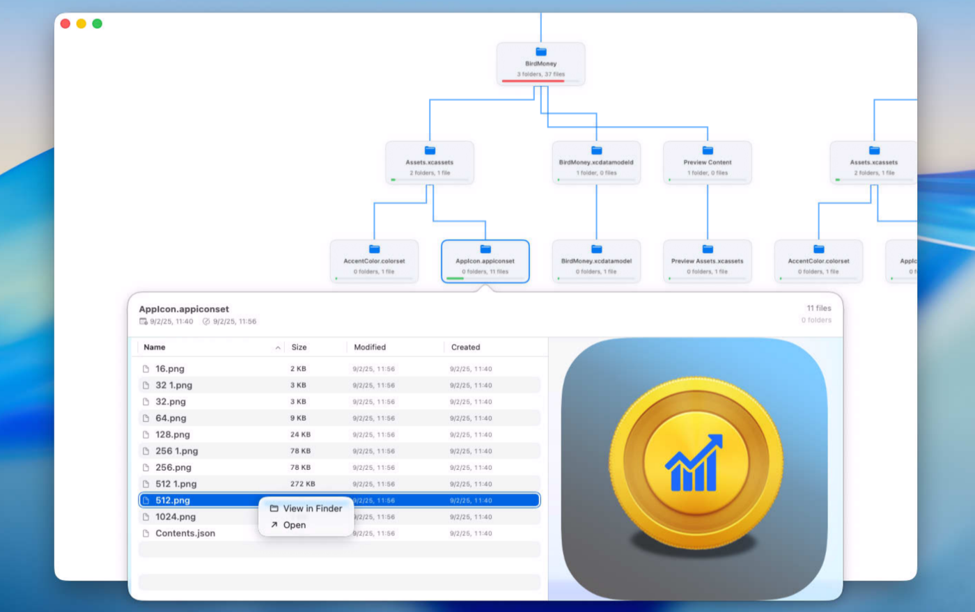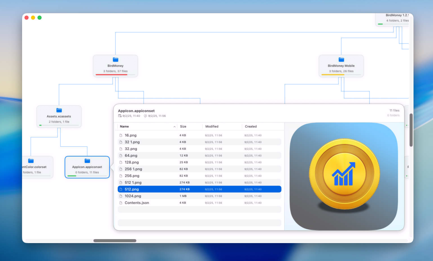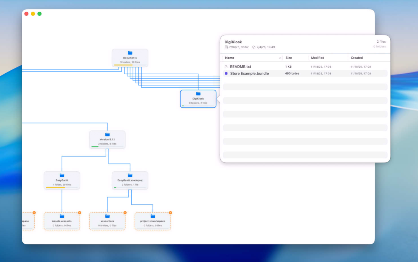 The layout adapts to your workflow: top-to-bottom, bottom-to-top, left-to-right, or right-to-left. You can tweak line color and thickness, adjust how “crowded” a folder must be to turn red, and choose whether to include package-like folders such as apps and bundles. Click a folder to open a popover with its contents, sort by name, size, or date, preview files with Quick Look, and open items in Finder or directly in the app.